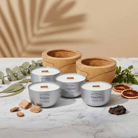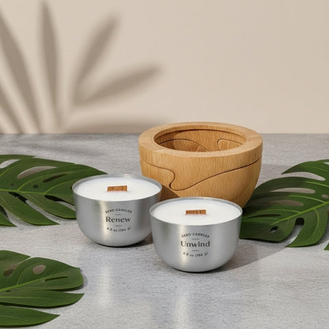 Get two of our natural wood candle containers and four candle refills in the scents of your choosing.